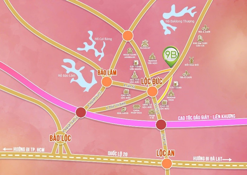 Top Garden Hills 9B tọa lạc tại xã Lộc Đức, Bảo Lộc, Lâm Đồng – ngay trục đường chính nhà nước, gần cao tốc Dầu Giây – Bảo Lộc – Liên Khương. Chỉ mất vài phút di chuyển đến các tiện ích quan trọng như chợ, trường học, bệnh viện, siêu thị, và sân bay Lộc Phát.