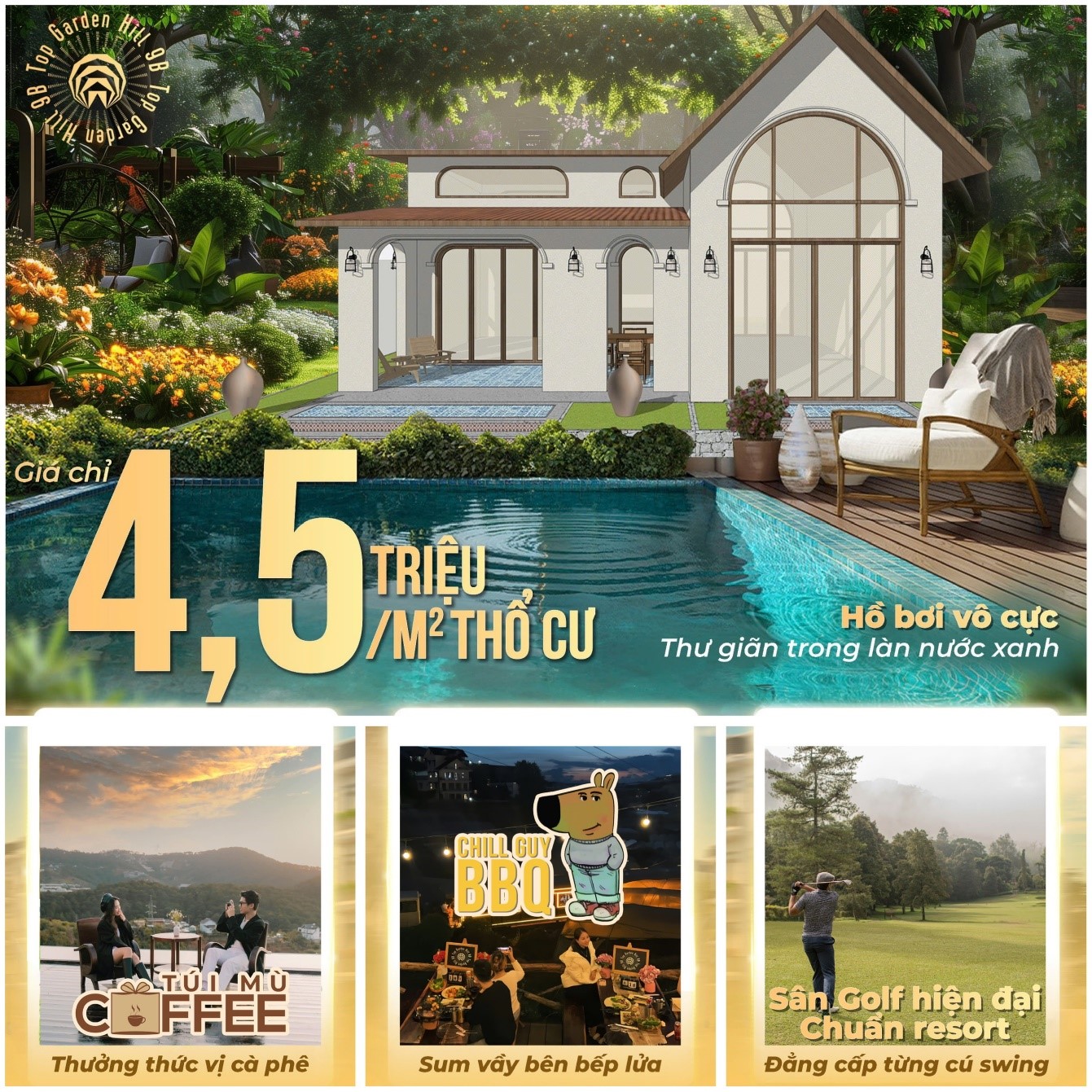 Top Garden Hills 9B tích hợp nhiều tiện ích hiện đại như khu Glamping, sân khấu biểu diễn, nhà hàng – cafe, khu nhà kính, khu lửa trại BBQ, và khu thể thao ngoài trời. Đây là lựa chọn lý tưởng cho nghỉ dưỡng và đầu tư sinh lời.